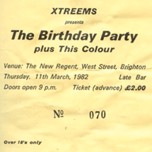 Le 11 mars 1982, The Birthday Party aurait joué à The New Regent, West Street, Brighton (GB), comme en témoigne le document suivant reproduit dans la vidéo (à partir de 2 minutes 45).
