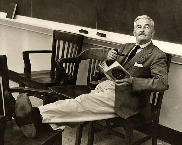 Ainsi, ce petit monsieur en frac recevant le prix Nobel des mains du roi Gustave VI de Suède, récipiendaire de la Légion d’honneur en 1951, écrivain en résidence deux semestres durant à l’université de Virginie en 1957-1958 (il faut le voir, les jambes étendues dans une salle de l’université de Virginie, pipe à la main, l’œil rieur, vide supra), ne se présentait en somme qu’en tant que « farmer ». La roublardise de Faulkner, sa splendide mythomanie, rappelée par Pierre Michon (lui-même hâbleur génial) est peut-être ce qui sauve son texte, en en faisant une chose faillible. À mieux dire, une œuvre. Un peu plus que du texte, en somme.