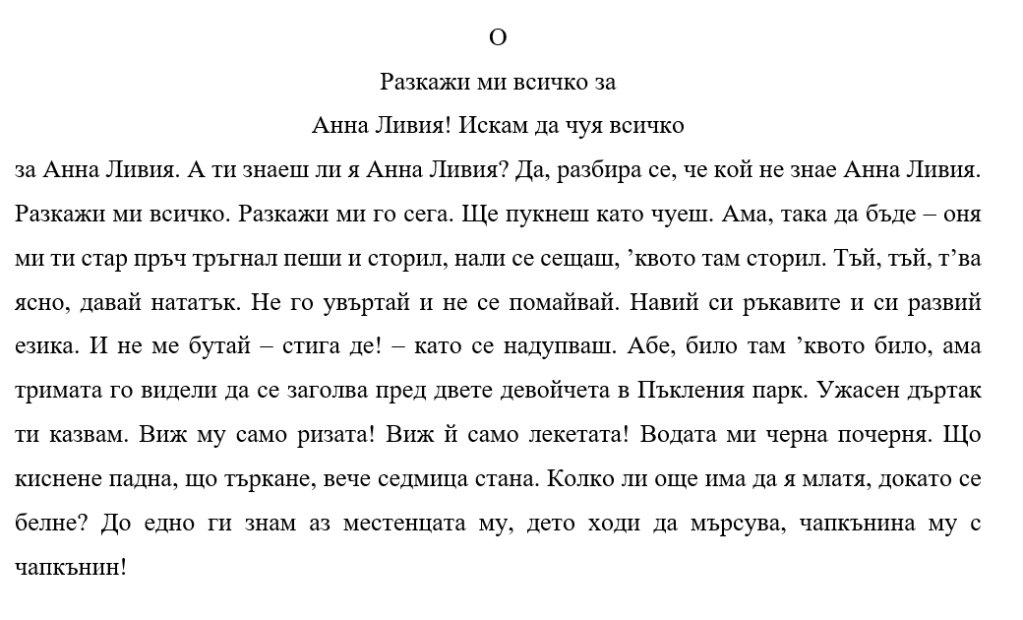 Nouvelle traduction, ci-dessous, du court passage de Finnegans Wake (190. 1-15) soumis à la sagacité de poètes et de traducteurs en langues aussi diverses et variées que le latin, le bangla, le grec ancien, le pseudo-moyen français, le picard de Berck, l’italien, l’espagnol du Mexique, le limbourgeois, le créole mauricien, etc. Ce coup-ci, en bulgare, et par les bons soins d’Iglika Vassileva, par ailleurs traductrice de Ulysses dans cette langue. L’ensemble des traductions recueillies jusqu’à présent se trouve ici.