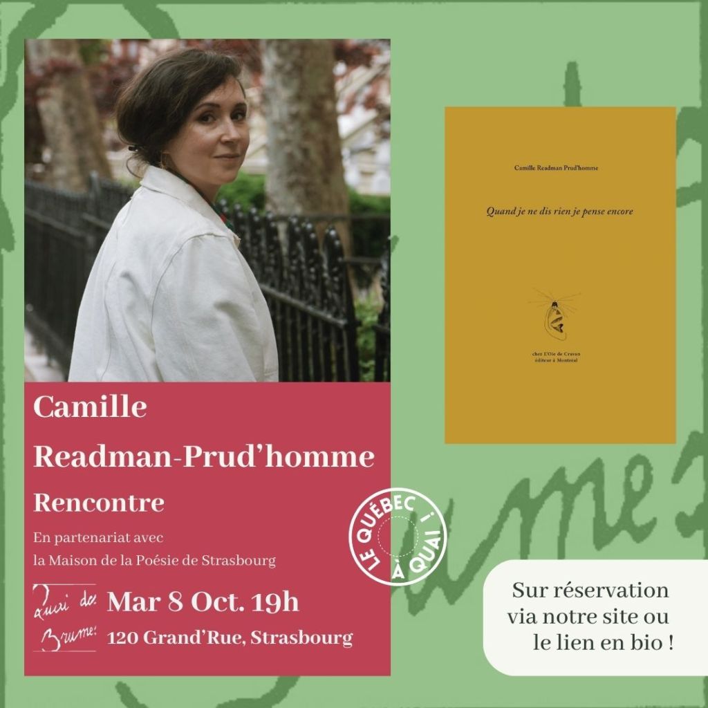 Dans le cadre des événements de la Maison de la Poésie de Strasbourg et du festival Le Québec à Quai, j’aurai l’honneur et le plaisir de poser quelques questions à Camille Readman Prud’homme, au sujet de Quand je ne dis rien je pense encore, son livre paru à L’Oie de Cravan (Montréal). Librairie Quai des Brumes, mardi, 8 octobre à 19 heures. Voir les détails ici.