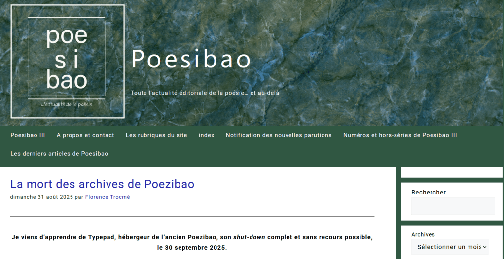 Florence Trocmé signale que les archives de Poezibao (avec un z) sont vouées à disparaître au 30 septembre 2025. Voir ici. Le travail de Florence Trocmé est un travail d’immense envergure (quelque 13 000 articles publiés sur le site de 2004 à fin 2022). La BnF dispose fort heureusement d’une copie de ce patrimoine littéraire.