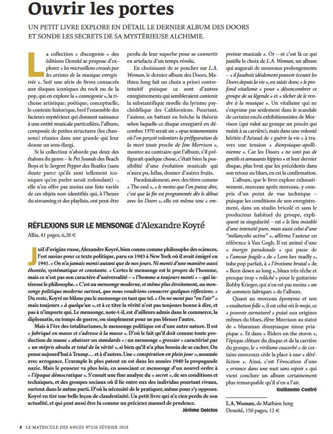 « Avec son iconique pochette marron sur laquelle a été posée une photo du groupe sur fond jaune, L.A. Woman reste un des albums les plus importants musicalement mais également un marqueur indélébile dans la mémoire collective d’une génération bercée par la poésie de Jim Morrison. Ce sixième disque des Doors sera également le dernier du groupe avec son chanteur idolâtré qui s’éteindra seulement 3 mois plus tard après la sortie de L.A. Woman, soit en juillet 1971. Fidèle à l’esprit de la collection, après une mise en contexte de l’album, Mathieu Jung explore dans les moindres recoins chacun des titres (“L.A. Woman”, “Been Down so Long”, “Riders in the Storm”…), enrichissant notamment son propos par des éclairages très pertinents sur les constructions et techniques musicales utilisées, permettant une lecture immersive autour de l’histoire d’un disque qui révèle ici tous ses secrets. » (Xavier-Antoine Martin (Longueur d’Ondes) [voir ici]).
