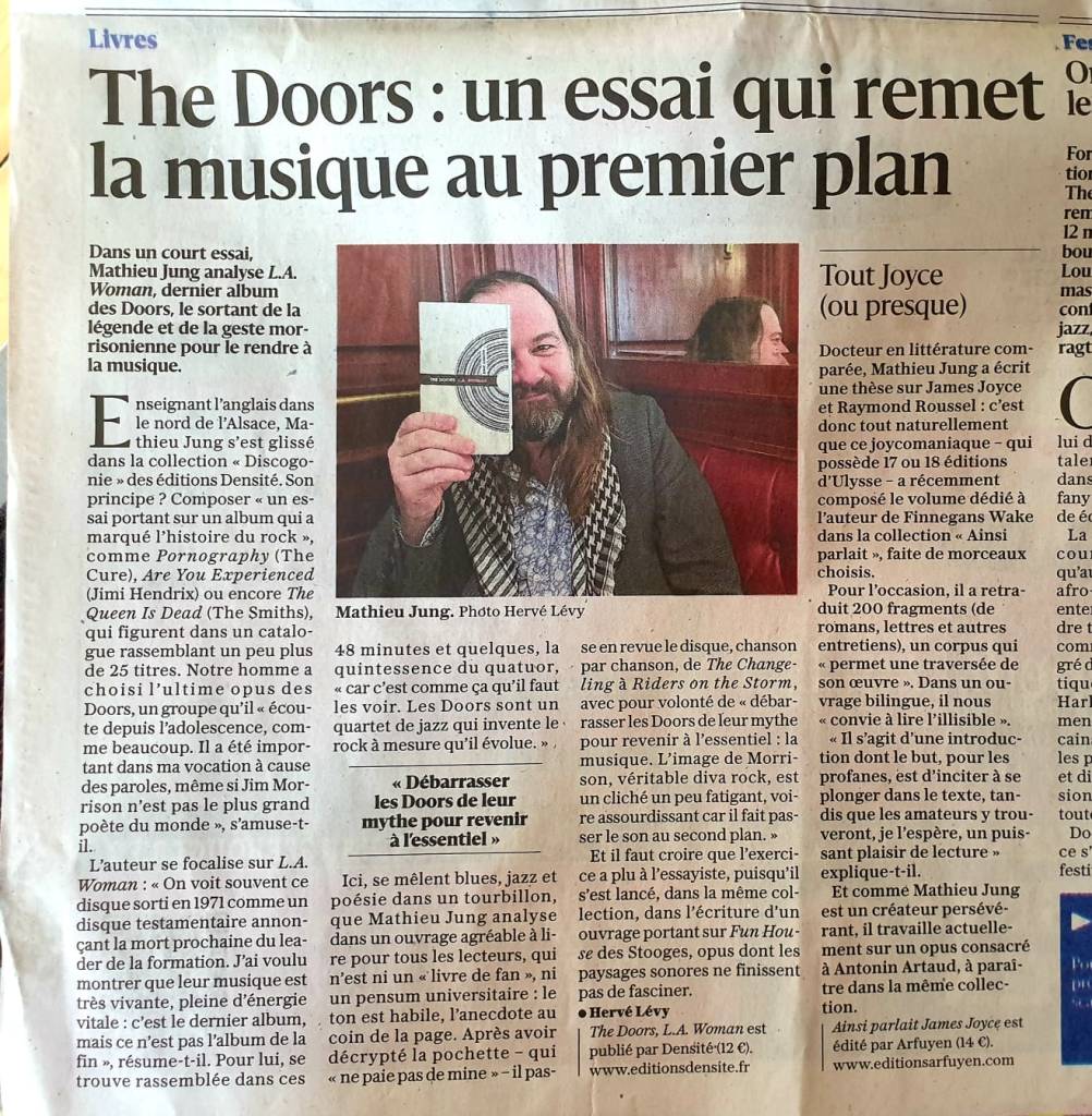Frédéric Perrot a lu L.A. Woman, et a réécouté l’album pour l’occasion. Un grand merci à lui. « Et bien sûr, à peine le livre refermé, preuve de sa réussite, le premier mouvement de tout lecteur un brin mélomane sera de réécouter aussitôt, en sirotant peut-être un verre de whisky, ce grand album de rock qu’est L.A. Woman ! » Article à lire en intégralité ici.